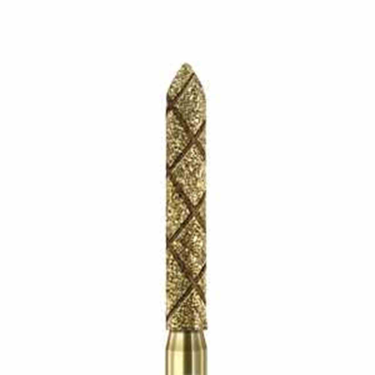 Cool-Diamanten - vergoldeter Schleifkörper Indikation: - Kronenpräparation Hinweise: - Die Oberfläche der Cool Diamant Schleifer ist durch asymmetrisch sich kreuzende Kanäle unterbrochen. Diese diamantierten Kanäle können zum einen eine erhöhte Menge Kühlflüssigkeit transportieren und unterbrechen zum anderen den Schleifvorgang bis zu 7 mal bei jeder Umdrehung des Schleifers. Beides fördert einen kühlen Schliff. Technische Daten: - Figur: CD78G (886) - ISO Größe: 016 / 1,6mm - Form: Zylinder spitz - Körnung: grob / grün - Länge Arbeitsteil: 10,0mm - Farbe: gold - Schaft: FG = 314 - Material Schaft: --- - Material Arbeitsteil: Diamantbelag mit Panzerschutzschicht
