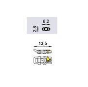 Sektorenschraube- Micro- Serie. Indikation: für Einzelzahnbewegung oder Regulierung kleiner Segmente. Eben- so zur Distalisierung im Unterkiefer. - Die Abwinklung des U-Bügels erleichtert die Positionierung im Zahnbogen. - filigrane Schrauben - guter Stabilität. Technische Daten: - Maße: 2,8 x 6,2 x 13,0 mm - Dehnung: 5 mm - 1/1 Umdrehung entspricht 0,35 mm - 1/4 Umdrehung entspricht 0,087 mm - Aufgesteckter, leuchtend gelber Drehrichtungspfeil.