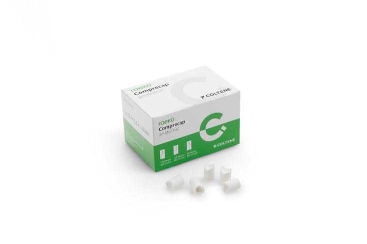 - Anatomisch geformte Kompressionshütchen, die durch die halbkreisförmigen Ausstanzungen an zwei gegenüberliegenden Seiten optimal an die Anatomie der Zahnreihe angepasst sind.