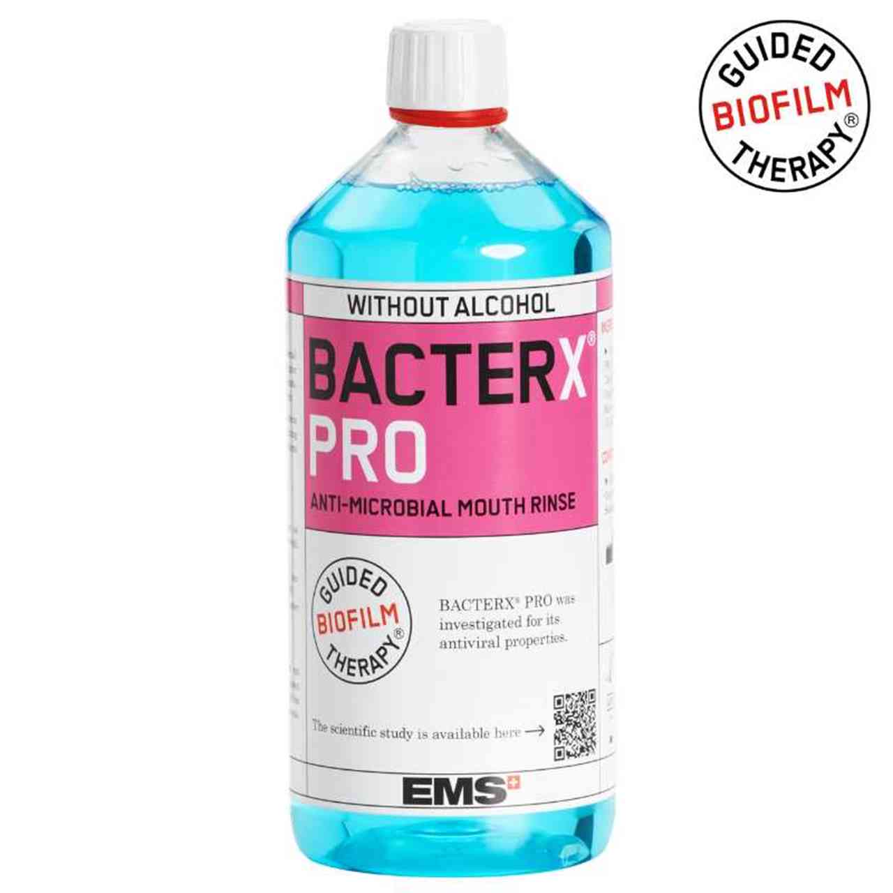 BacterX Pro - ohne Alkohol Indikation: - Für den professionellen Einsatz in der Zahnarztpraxis. Hinweise: - Reduziert die Anzahl lebensfähiger Bakterien und Viren in Aerosolen und damit die Bakterien- und Virenlast für Patienten und Praxispersonal - Bekämpft oralen Biofilm und beugt Karies vor - Fördert die Zahngesundheit und einen frischen Atem - Angenehmer Geschmack Technische Daten: - ohne Alkohol - Inhaltsstoffe: 0,1 % Chlorhexidindigluconat (CHX), 0,05 % Cetylpyridiniumchlorid (CPC) und 0,01 % Natriumfluorid (0,005 % Fluorid)