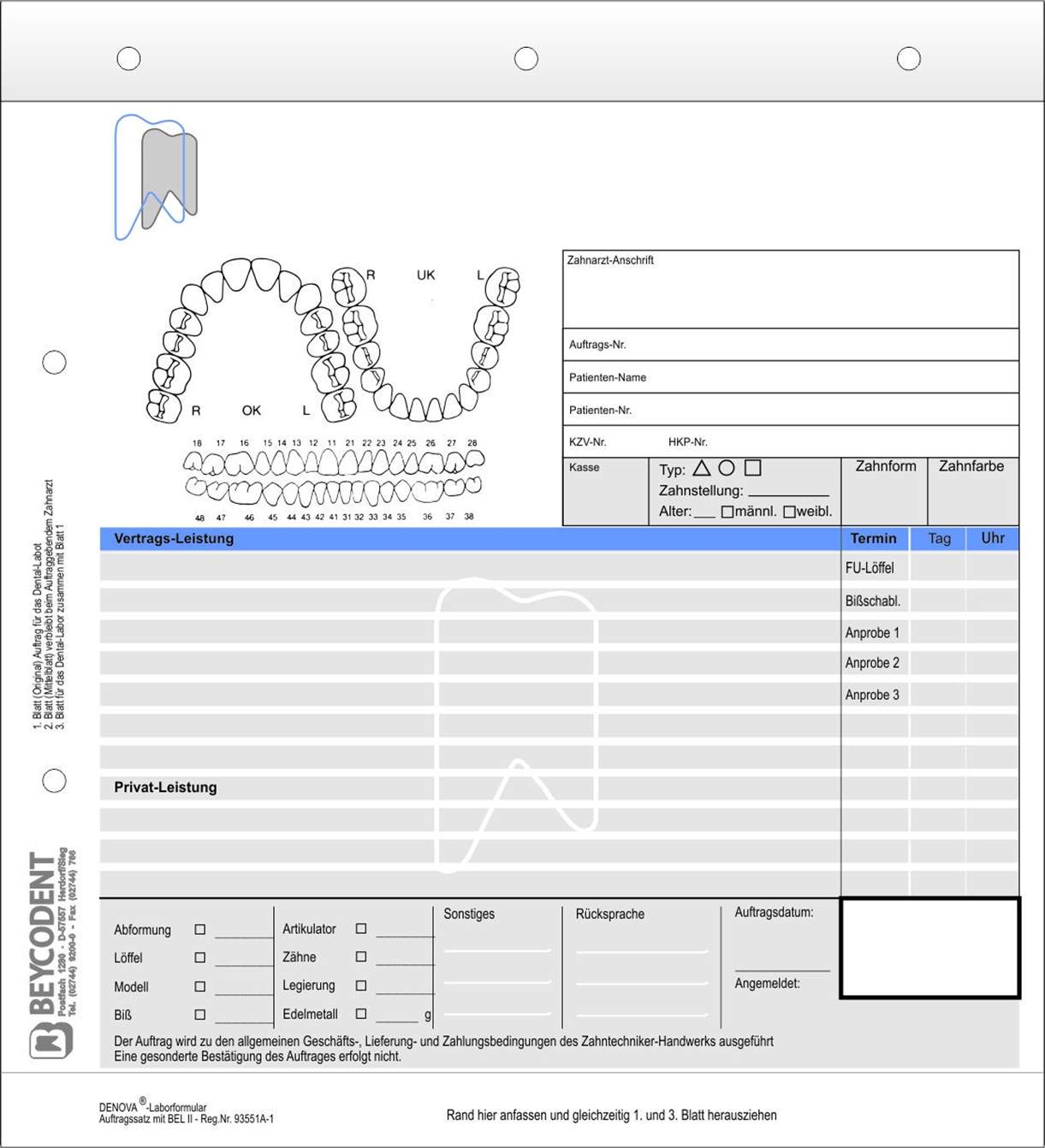 Laboraufträge - 3-fach Indikation: - Der professionelle Auftragssatz für Zahnarzt und Dental-Labor! mit Feld XML-Auftrags-Nr. Hinweise: - neutraler Auftragssatz - mit Feld für die Kennzeichnung gem. KZV Ausführung: - 100 Stück Packung - Format: 20 x 21 cm - Druck: 1-farbig - 3-fach-Spezialsatz - geblockt - fortlaufend nummeriert - neutral - 1.und 3. Blatt gleichzeitig heraustrennbar - auf der Rückseite des 3. Blattes ist der Techniker-Arbeitsschein (BEL II) aufgedruckt - 2. Blatt verbleibt im Block, bzw. in Mappe - Geeignet für Mappen mit Klemm-oder Stiftmechanik