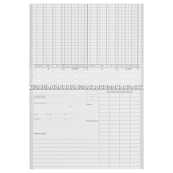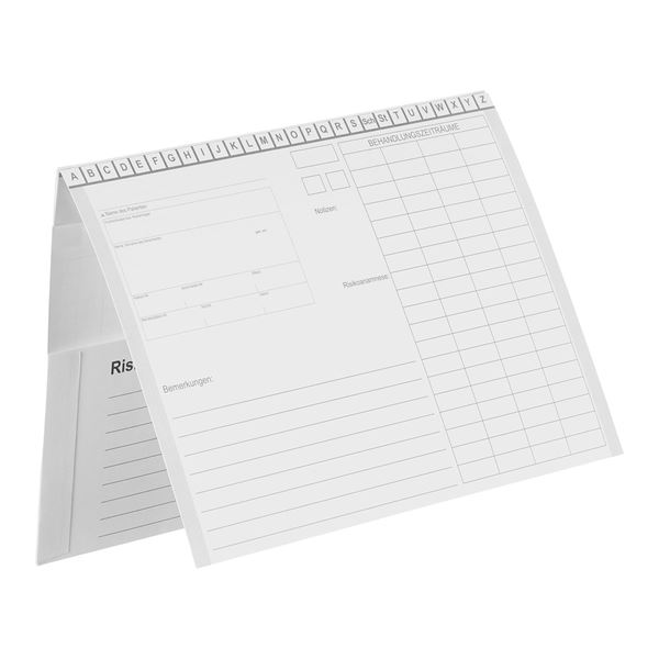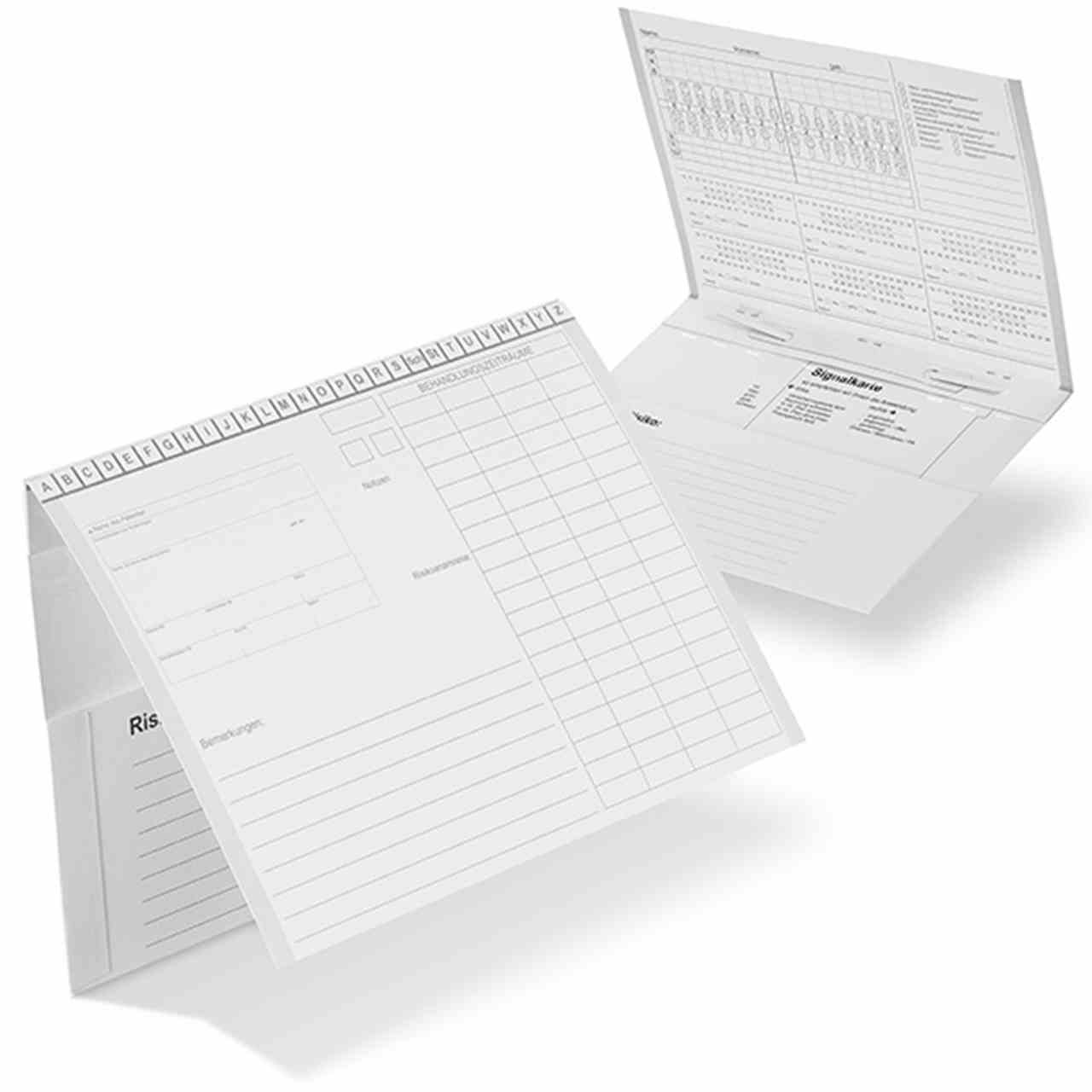 Karteimappe DIN A5 D70 - Zahnarztkartei Indikation: - die Zahnarztkartei mit eingezogener Heftzunge Hinweise:- - Die Tasche im Innenteil der Patientenkarteimappe nimmt Schriftgut und Notizen auf - die Tasche ist so angeordnet, dass der Zugriff auf den - Inhalt leicht ist, andererseits aber auch nichts aus der Karteimappe herausfallen kann! - Diese Zahnarztkartei ist mit bereits eingezogener Heftzunge, - für durchdachte Auswahl Einlegeblätter - (Krankenblätter) für die Systemkartei, - Chipkarten-Adressfeld, - Innenseite der Behandlungskartei hat übersichtlich Platz 9 für 01-Befunde, Risikoanamnese usw., - großzügige Innentasche, 9 Stanzungen für farbig e Signal- Aufstecker. (Reiter) Lieferunfang: - 100 Stück Packung