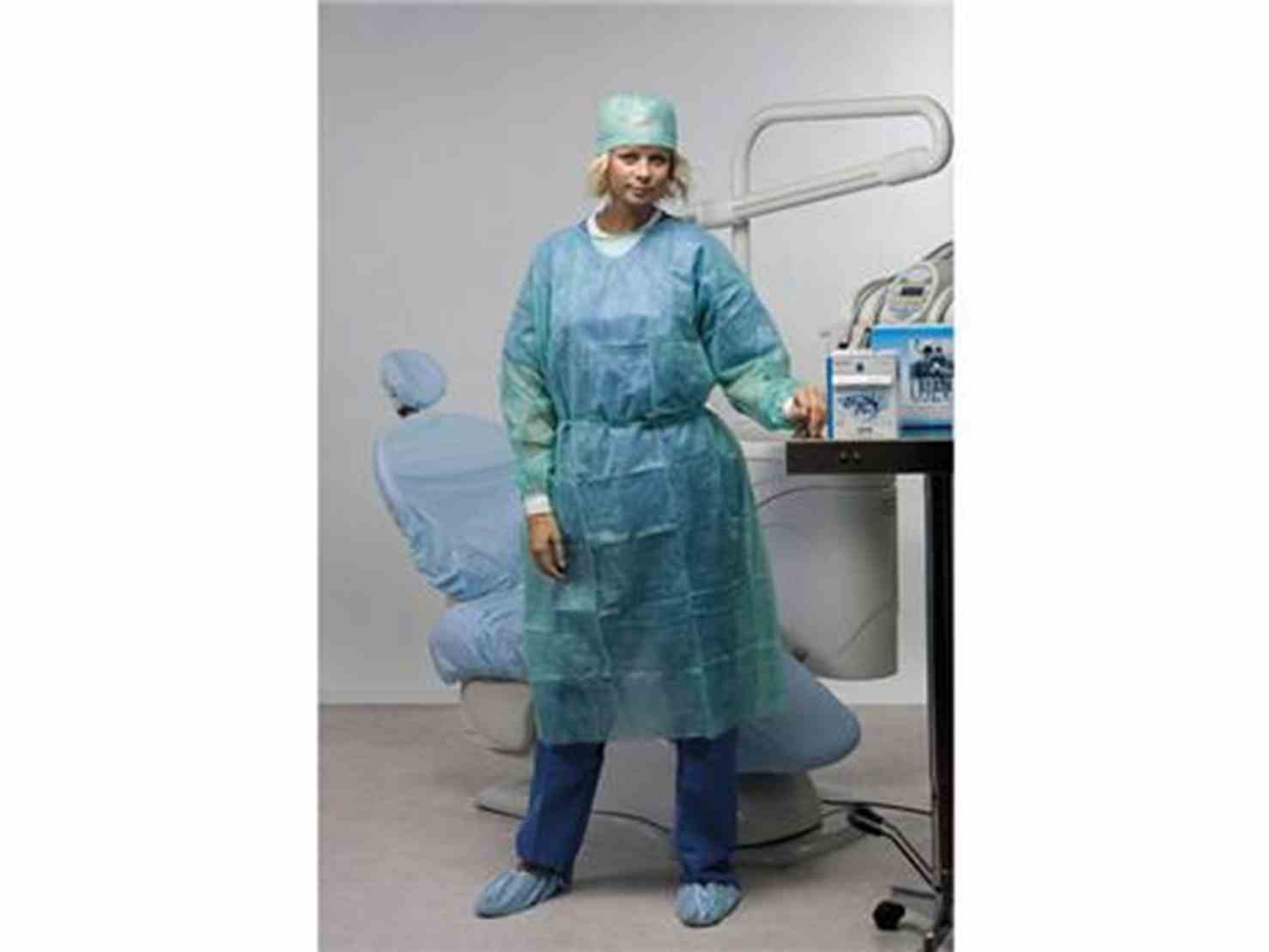 - OP-Kittel aus trageleichtem Vliesstoff in den Farben grün und hellblau.