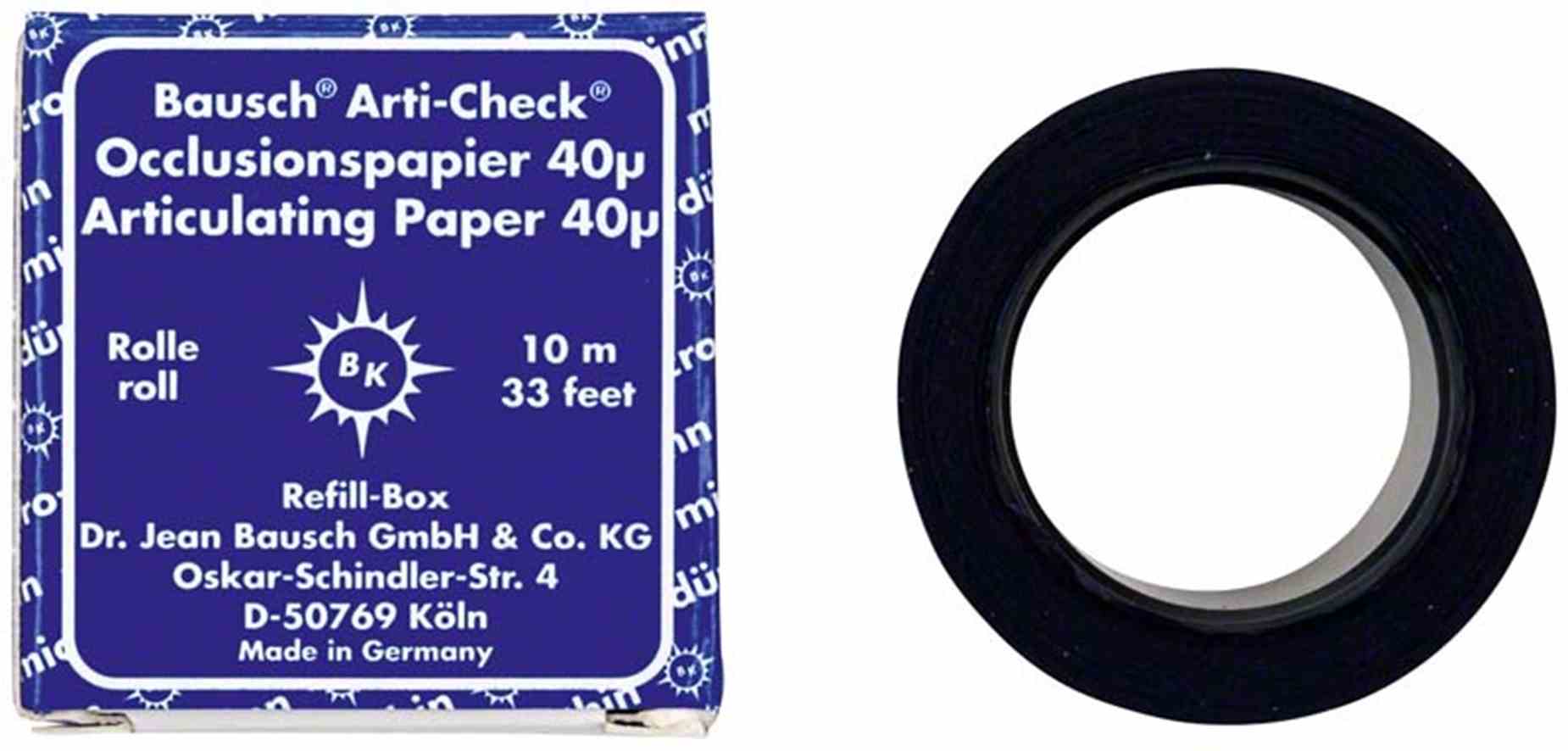 Bausch Occlusionspapiere 40my sind hauchdünne reißfeste Papiere, die beidseitig mit Liquidfarben beschichtet sind. Nachfüllrolle für Spender BK15.