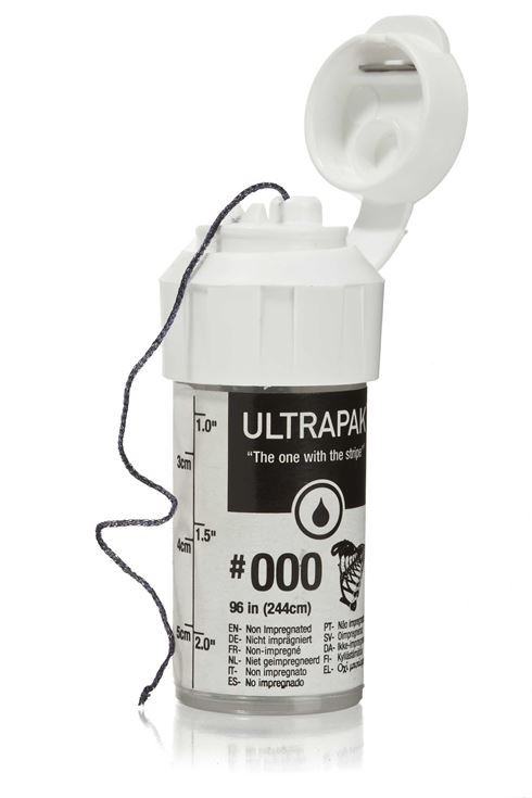 Ultrapak - Gestrickte Retraktionsfäden Indikation: - für schnelle Gewebeverdrängung und detaillierte Randdarstellung Hinweise: - wird beim Legen komprimiert und dehnt sich dann zur optimalen Retraktion aus - verfängt sich nicht in Diamantschleifern - Kontrastreiche Farben erleichtern Identifikation und Entfernen - CleanCut Design besitzt eine Klinge in der Verschlusskappe für effizientes Schneiden Technische Daten: - Material: 100% Baumwolle Lieferumfang: - 1x #00 Faden - 1x #0 Faden - 1x #1 Faden - 1x #2 Faden - 1x Ultrapak-Organisationsständer