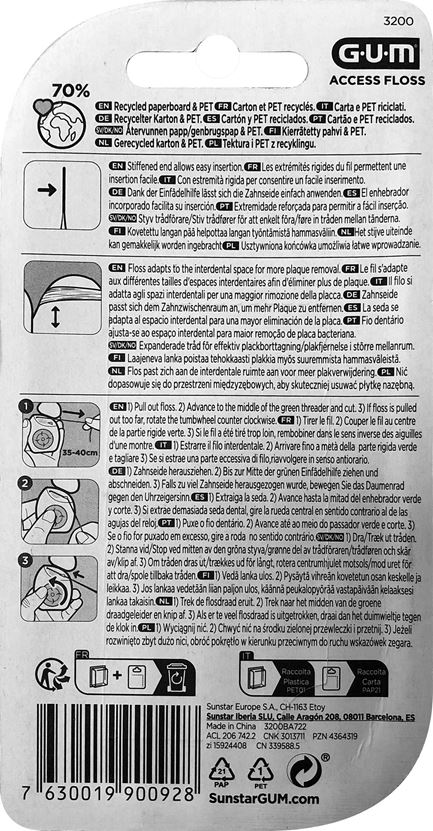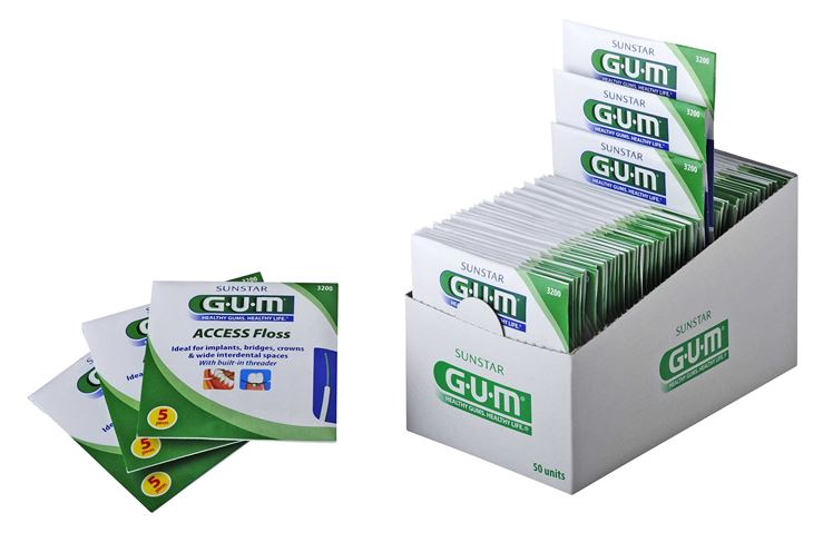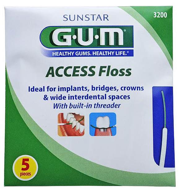 - Die GUM ACCESS FLOSS Zahnseide mit der praktischen Einfädelhilfe erleichtert Ihren Patienten die effektive Reinigung unter und um Kronen, Brücken, Implantaten und großen Zahnzwischenräumen. Die Zahnseide flauscht in der Verwendung auf, um sich an verschieden große Zahnzwischenräume anzupassen und sorgt so für mehr Kontakt mit der Zahnoberfläche.