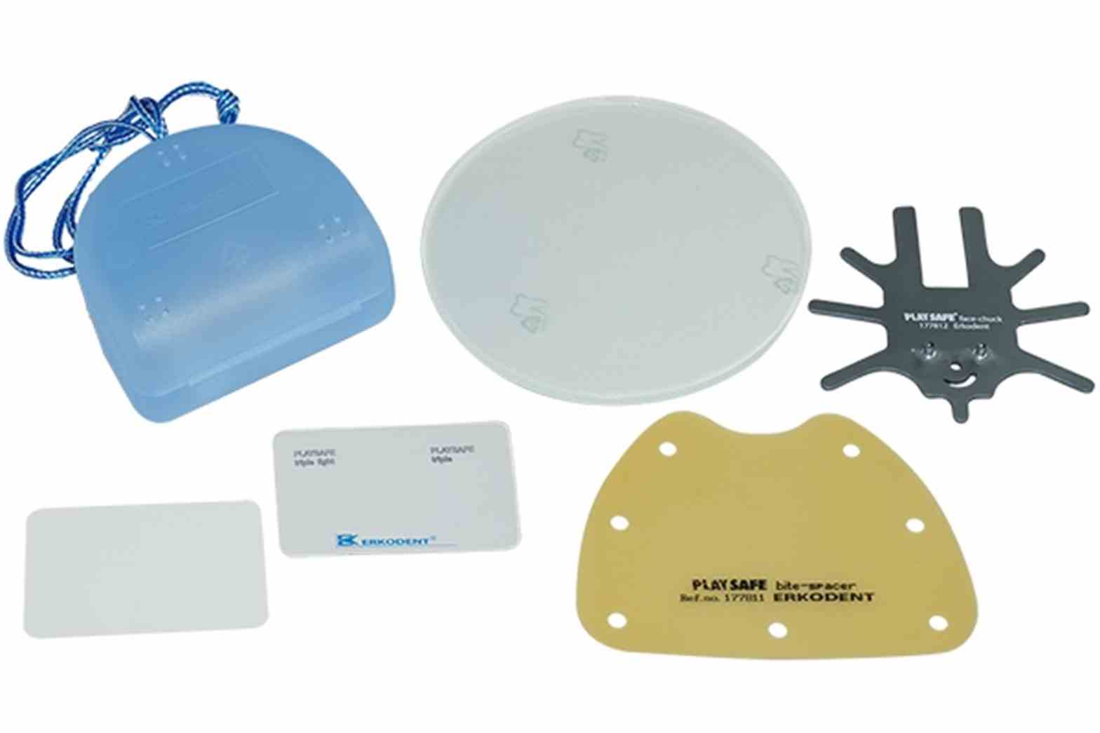 Playsafe triple light Starter Set - Notwendiges Set zur Herstellung eines dreischichtigen Playsafe triple light Sportmundschutz bei Gerätekombination Erkoform der Serie 3 mit Occluform-3. Indikation: - Playsafe triple light ist für kleine Mundverhältnisse geeignet. Hinweis: - Ein Playsafe triple light ist in der gleichen Zeit wie ein einschichtiger Sportmundschutz herstellbar, bietet aber mindestens die gleiche Schutzwirkung wie die laminierte Version Lieferumfang: - 1 Playsafe bite spacer - 1 Playsafe face chuck - 1 Playsafe triple light Set (1 Playsafe triple light Folie transparent, 1 FG-Blatt, 1 Erkobox, 1 Anleitung, 1 Label).