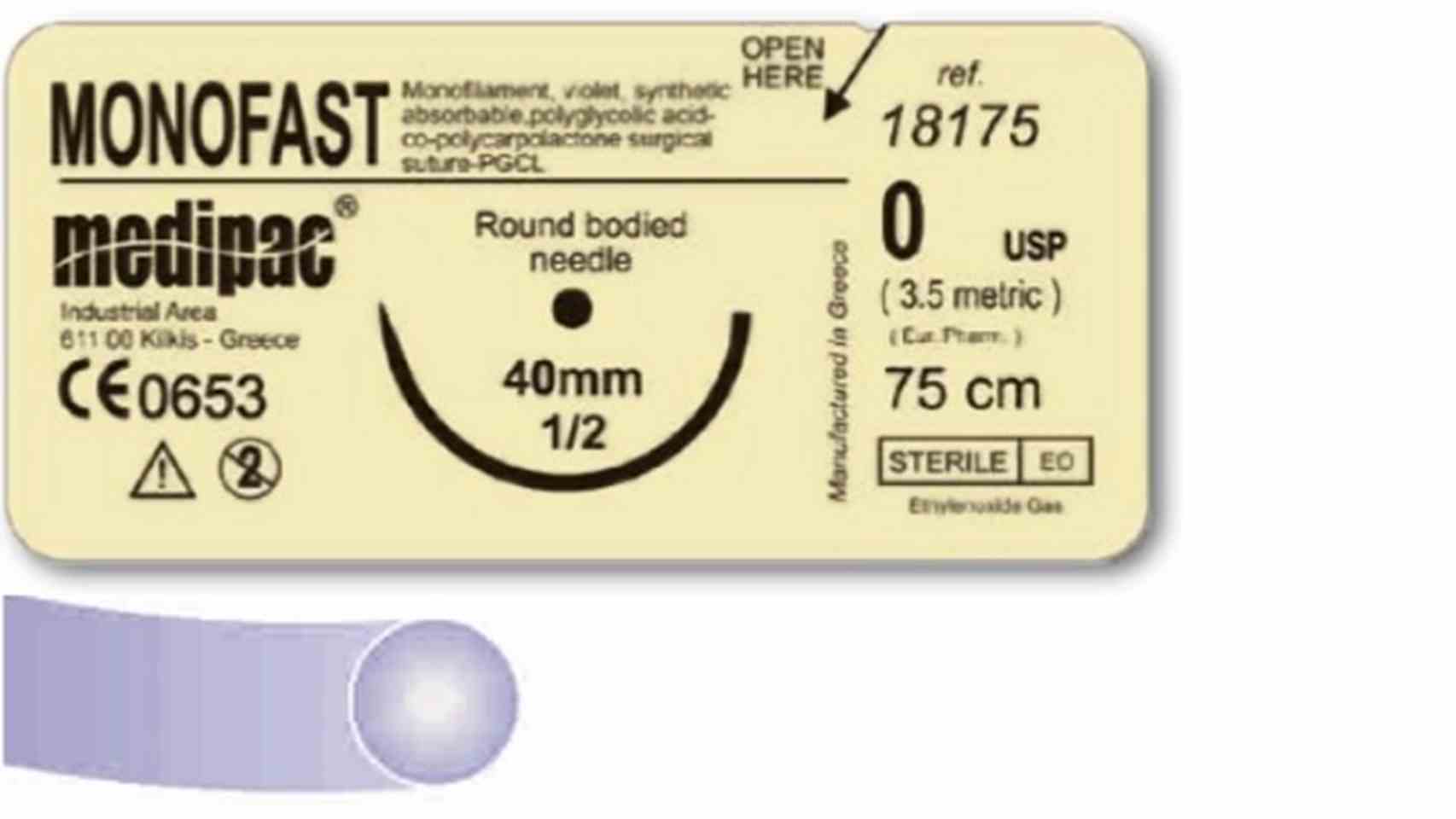 Violetter, monofiler und resorbierbarer Faden aus Polyglykolsäure. Nadelform: 1/2 kreisförmig = H, Rundkörpernadel =R, Nadellänge: 17mm. Fadenstärke: 4-0, Fadenlänge: 75cm. Resorptionsprofil: am Ende der ersten Woche noch eine Zugfestigkeit von über 68 - 78% und bis zu 30% zum Ende der zweiten Woche. Die Resorption der Naht ist innerhalb von 90 bis 110 Tagen abgeschlossen.